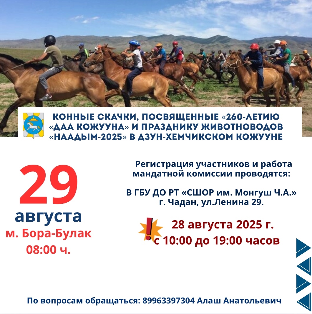 В Дзун-Хемчикском кожууне 29 августа 2025 года в 08.00 в м. Бора-Булак состоятся Республиканские соревнования по конным скачкам посвященных 260-летию Даа кожууна и празднику животноводов «Наадым-2025» в Дзун-Хемчикском кожууне.