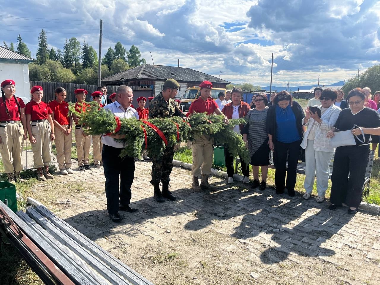 Прошла церемония возложения гирлянды к памятнику, в котором приняли участие ГлаваОоржак Е. Б,участник СВО Дадар- оол Буян и юнармеец.