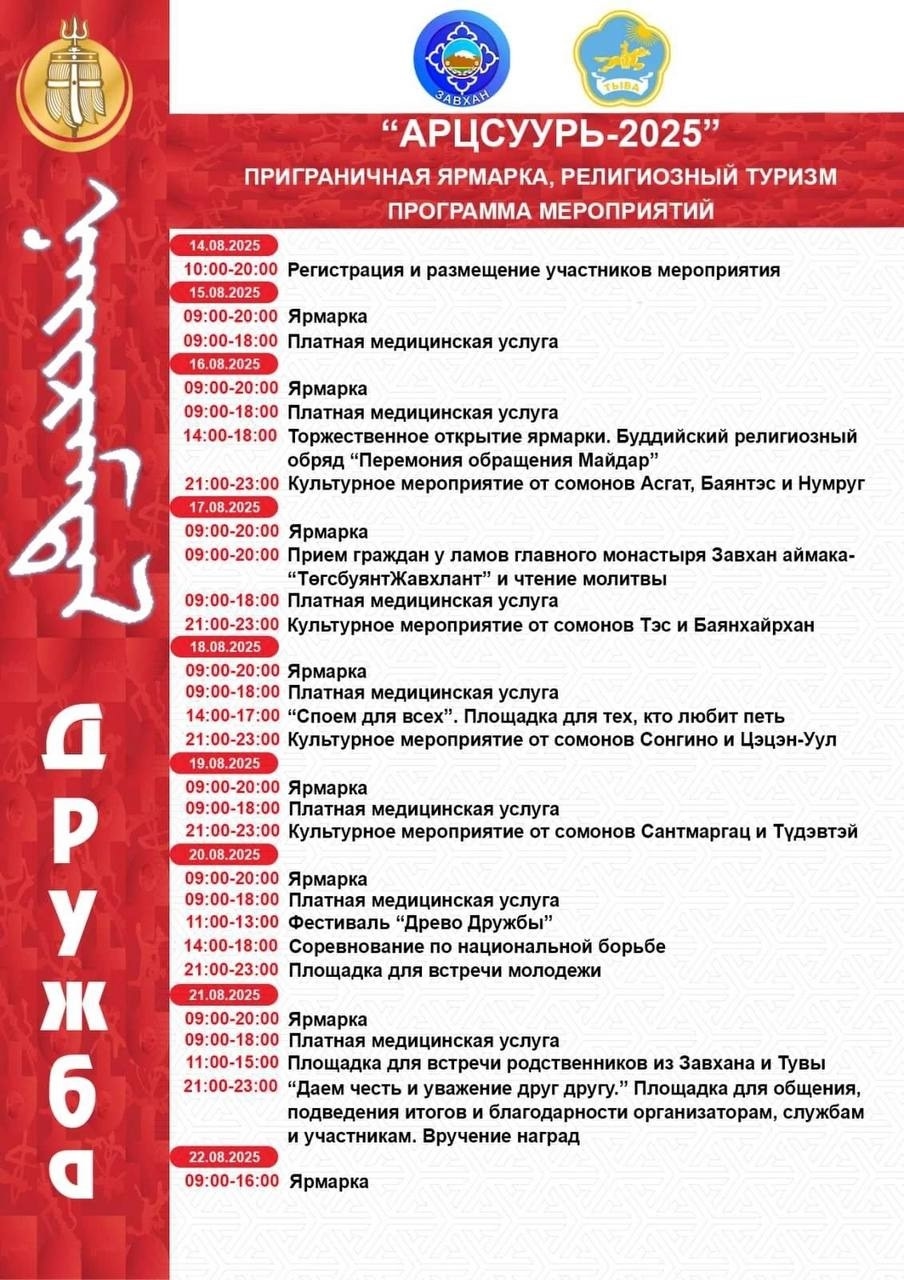 С 15 по 22 августа 2025 года в селе Арц-Суурь Завханского аймака Монголии пройдёт приграничная ярмарка, организованная монгольской стороной.