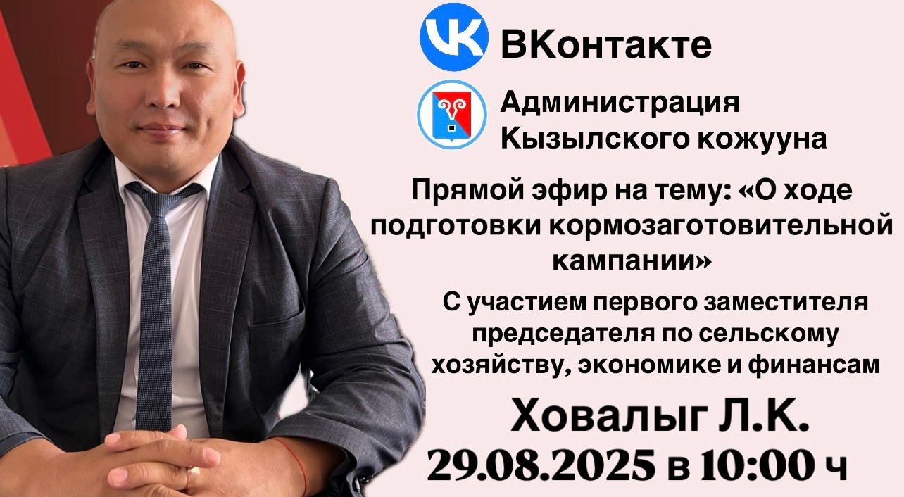 Добрый день, уважаемые жители Кызылского кожууна! Сообщаем, что 29 августа 2025 года в 10:00 часов состоится прямой эфир с участием первого заместителя председателя по сельскому хозяйству, экономике и финансам — Ховалыг Леонид Кызыл-оолович. Будем рады вашим вопросам и предложениям в ходе встречи. С уважением, Администрация Кызылского кожууна #АдминистрацияКызылскогоКожууна #Прямой_эфир #ПЭ