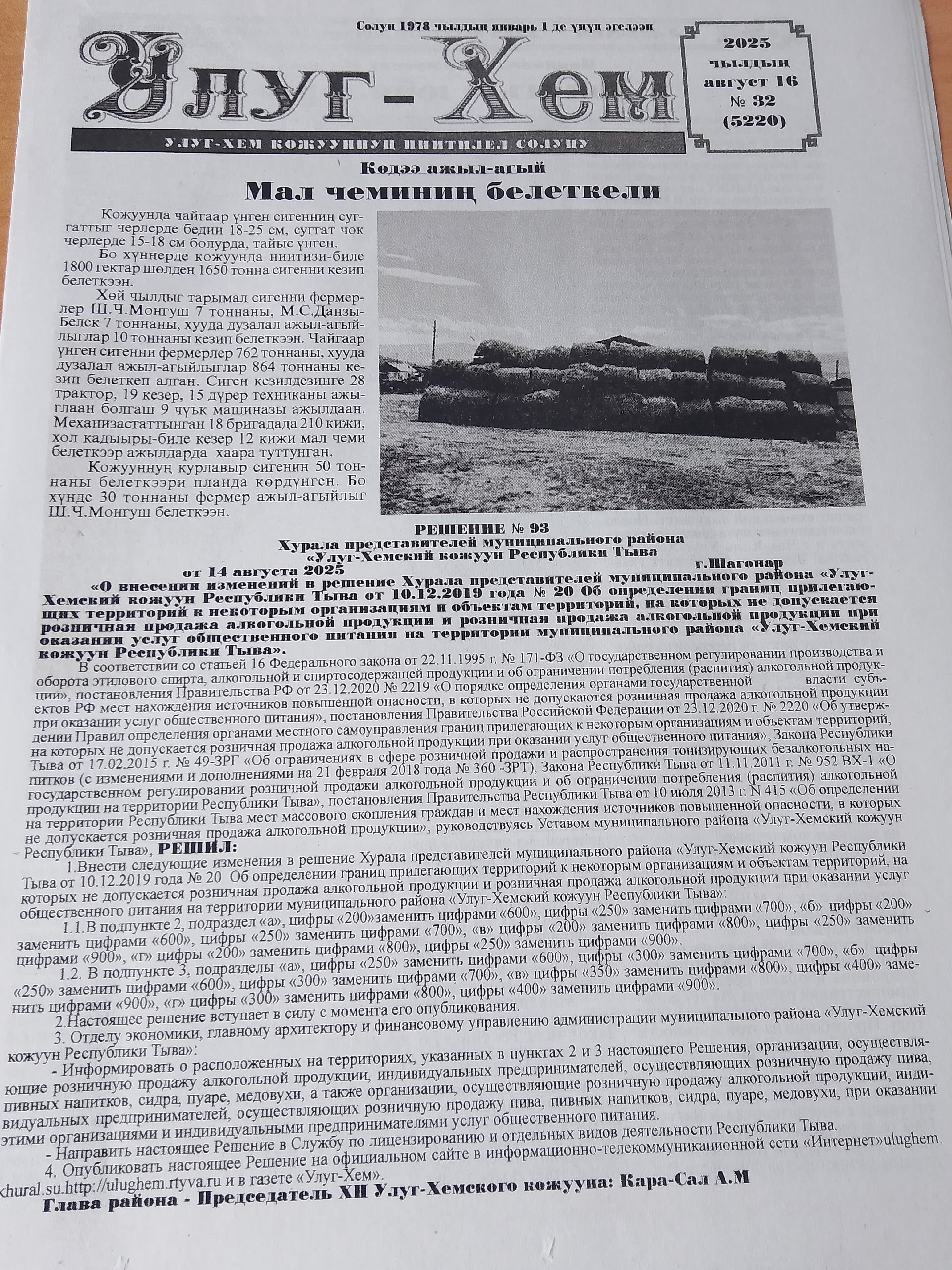 С радостью сообщаем, что вступило в силу решение Хурала представителей муниципального района «Улуг-Хемский кожуун Республики Тыва» о внесении изменений в порядок определения границ прилегающих территорий к некоторым организациям и объектам, на которых не допускается розничная продажа алкогольной продукции.