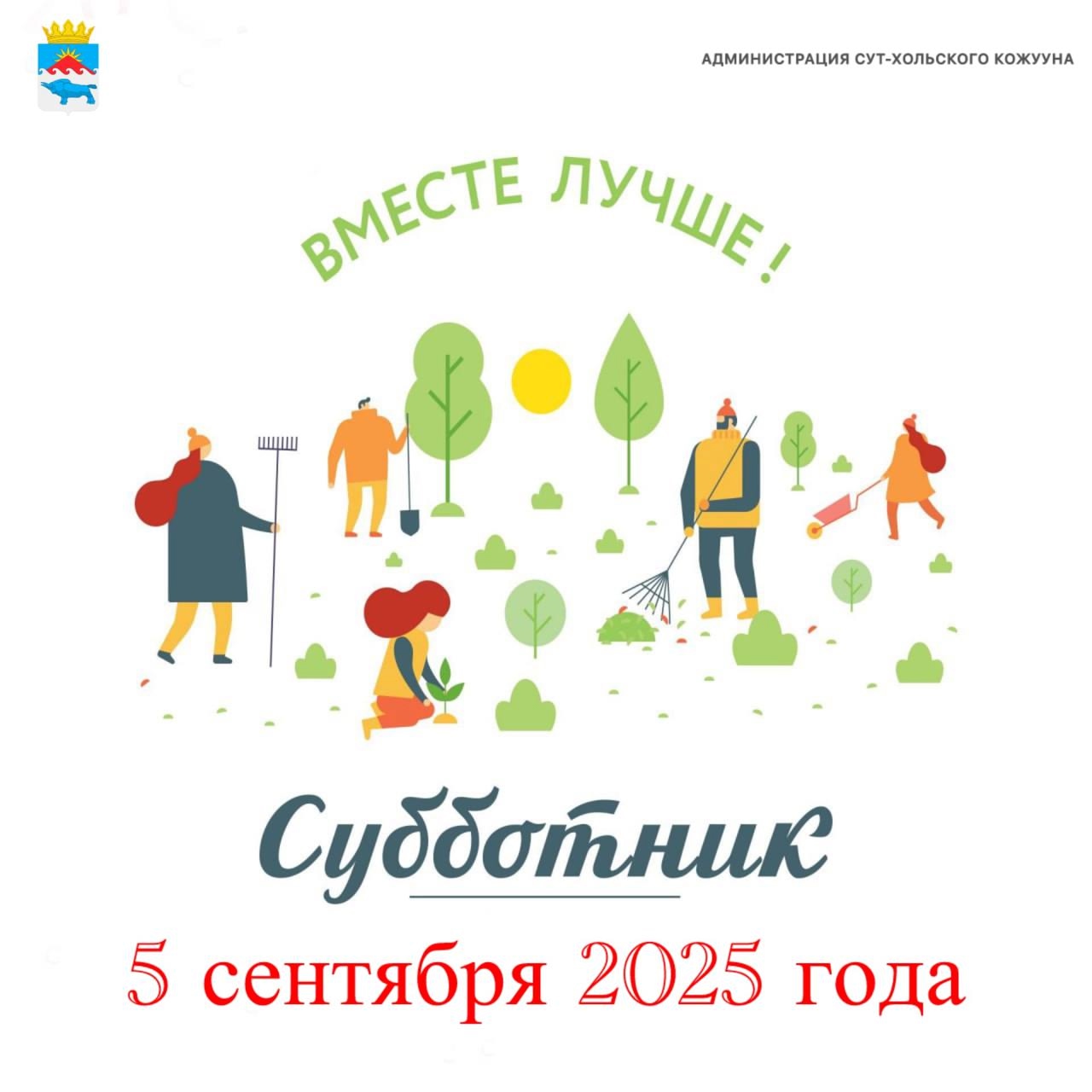 Дорогие жители Сут-Хольского кожууна! Приглашаем вас принять участие в субботнике, который состоится 5 сентября. Это отличная возможность внести свой вклад в благоустройство нашего района. Дата: 05.09.25 Место сбора: территория Сут-Хольского кожууна Мы будем очищать улицы и другие общественные пространства от мусора и приводить их в порядок. Пожалуйста, возьмите с собой удобную одежду, перчатки и, если возможно, инвентарь для уборки (метлы, грабли и т.д.). Присоединяйтесь к нам, давайте сделаем наш кожуун еще чище и красивее! Ваши активные действия делают наш район лучше! Ждем вас на субботнике! С уважением, Администрация Сут-Хольского кожууна!