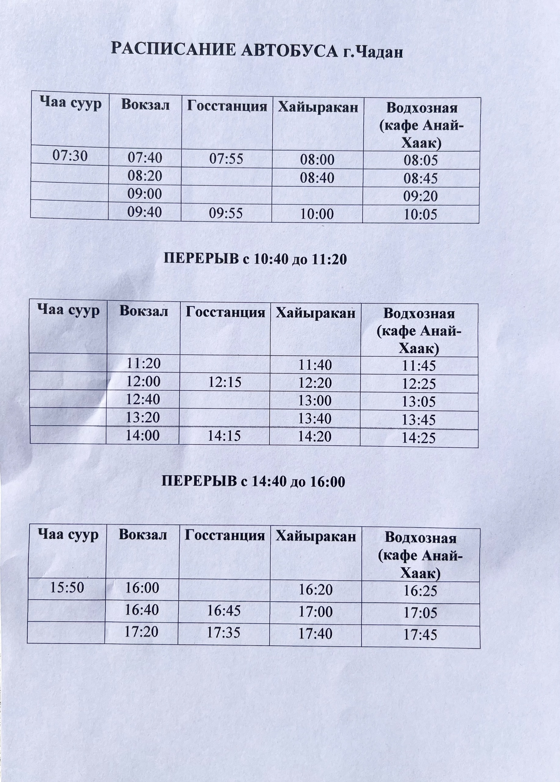 Уважаемые жители города Чадан! Просим вас ознакомиться с новым графиком движения городского автобуса. Пожалуйста, внимательно изучите расписание и планируйте свои поездки заранее. Благодарим за понимание!