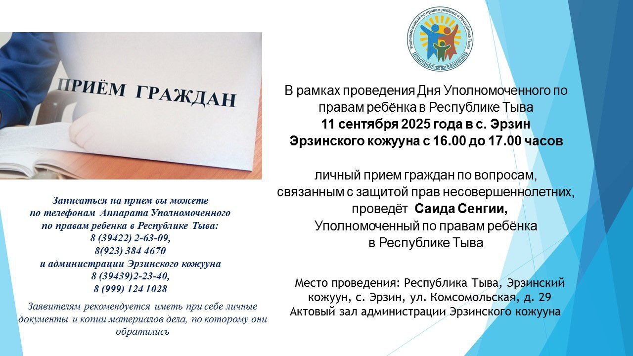 Уполномоченный по правам ребенка РТ проведет приём граждан в Эрзинском районе В селе Эрзине Эрзинского района 11 сентября с 16.00 до 17.00 Уполномоченный по правам ребенка РТ Саида Сенгии проведет личный прием граждан по вопросам, связанным с защитой прав несовершеннолетних. Прием будет осуществляться по адресу: с. Эрзин, ул. Комсомольская, д. 29 в актовом зале администрации Эрзинского района. Записаться на приём можно по телефонам Аппарата Уполномоченного по правам ребенка в РТ: 8 (39422) 2-63-09; 8 – 923-384-46-70. А также по телефонам администрации Эрзинского района: 8 (39439) 2-23-40; 8 (999) 124-10-28. Заявителям рекомендуется иметь при себе личные документы и копии материалов дела, по которому они обратились. Фото Аппарата Уполномоченного по правам ребенка в РТ