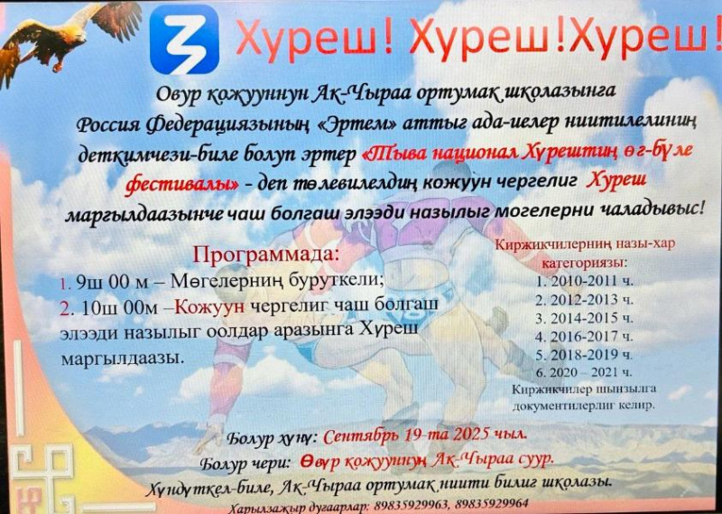 Сентябрь 19-та Ак-Чыраага болур кожууннун чаш болгаш элээди могелерин кожуун чергелиг Тыва хуреш маргылдаазынче чалап тур бис.