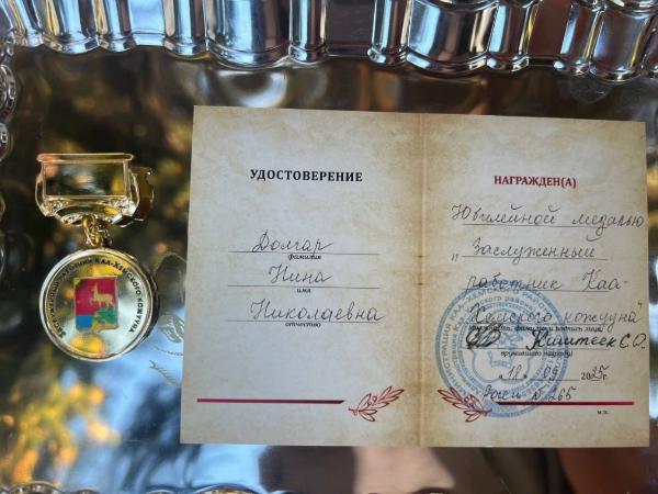 Так за многолетний и добросовестный труд юбилейной медалью " Заслуженный работник Каа-Хемского кожууна " награждена ветеран труда Долгар Нина Николаевна.