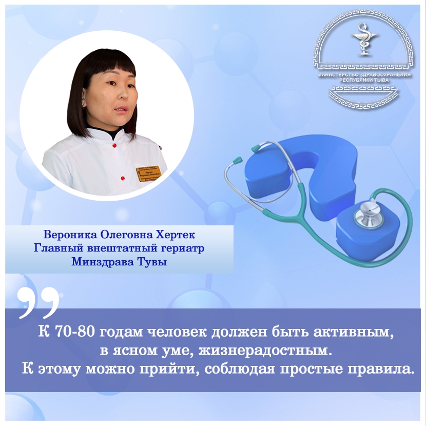 #Спросите_доктора: Какие правила надо соблюдать для здорового и активного долголетия Об этом рассказала главный внештатный гериатр Министерства здравоохранения Республики Тыва Вероника Олеговна Хертек во время прямого эфира на нашем канале. "К 70-80 годам человек должен быть активным, в ясном уме, жизнерадостным. К этому можно прийти, соблюдая простые правила", - подчеркнула врач. Медицинские правила просты: регулярно проходить профилактические осмотры и диспансеризацию. Государство предоставляет такую возможность бесплатно раз в год, а работающим гражданам выделяется для этого выходной день. Физическая активность - неотъемлемая часть здоровой жизни. Ежедневная ходьба не менее 30 минут укрепляет мышцы, сердце и сосуды, улучшает кровоснабжение мозга и сохраняет когнитивные функции. Правильное питание играет ключевую роль: еда должна быть сбалансированной по белкам, жирам и углеводам. Белок - строительный материал наших мышц. В пожилом возрасте его должно быть не менее 1,2 г на 1 кг веса. Это мясо, молочные продукты или белковые добавки, которые помогают сохранить бодрость и сопротивляемость организма инфекциям. Социальная активность и ментальное здоровье — залог долгой и счастливой жизни. Общение с близкими, участие в мероприятиях, чтение, настольные игры и волонтёрство помогают сохранить память и внимание. — Рекомендую пожилым людям читать вслух хотя бы 5 страниц в день, — советует Вероника Хертек. — Это тренирует память и укрепляет связь поколений, если заниматься с внуками. Безопасная среда дома тоже важна: уберите скользкие коврики, удлинители, обеспечьте ночное освещение. Если пожилой человек живёт один, стоит подумать о тревожной кнопке или регулярных звонках - это может спасти жизнь. И, конечно, отказ от вредных привычек: курение, переедание, злоупотребление алкоголем и малоподвижный образ жизни. Оценить состояние здоровья и пройти скрининг гериатрических синдромов можно в Гериатрическом центре Республики Тыва по адресу: г. Кызыл, ул. Ленина, 44 (1 этаж) Телефон для записи: 5-48-66 #Прямой_эфир