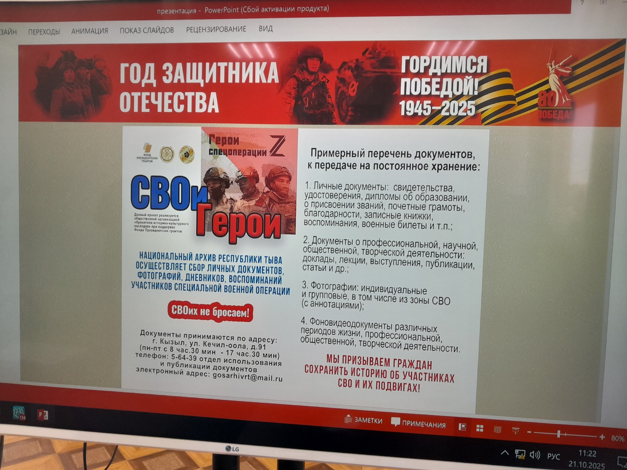 Тыва "Бистиң маадырларывыстың" төрелдериниң кичээнгейинге! Тыва Республиканың Национал архиви тускай шериг операциязының киржикчилерин деткиири-биле оларның документилерин хумагалаар фондузун тургузуп турар. Тыва Республиканың Национал архивинде тускай шериг операциязының киржикчилерин деткиириниң талазы-биле ажылдарны чорудуп турар. Ол фондуже дужаар ужурлуг документилерниң даңзызының чижээ: 1. Хууда документилери: херечилели, шынзылгазы, өөредилге аттестады база диплому, хүндүлел бижиктери, шаңналдары, военный биледи база өске-даа документилери; 2. База бир документилери: профессионал ажыл-агайының, уран-чүүл база эртем-билиг талазы-биле чедиишкиннери; 3. Чуруктары: хууда, өг-бүлези, бөлүк улус-биле (эштери, төрелдери-биле тыттырган чуруктары); 4. Янзы-бүрү хемчеглерге тыттырган видеолары. Тыва "Бистиң маадырларывыстың" төрелдеринге кыйгырыг! ТШО-га мөчээн шериг маадырларывыстың дугайында келир салгалдарга дамчыдар угаан-медерелди арттыраалыңар! Айыттынган доккментилерни дараазында адреске эккеп дужаап болур силер: Кызыл хоорай, Кечил-оол кудумчузу, бажың 91, Тыва Республиканың Национал архиви. e-mail: gosarhivrt-oipd@mail.ru. Телефон: 8-394-22-5-64-39.