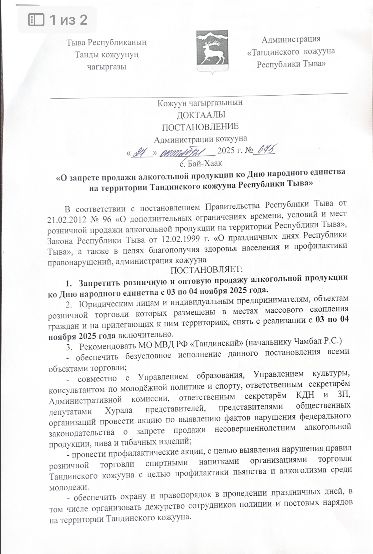 В преддверии выходных и праздничных дней, субъектами профилактики администрации Тандинского кожууна ознакомлены Постановлением администрации Тандинского кожууна от 27.10.2025 г. № 675 "О запрете продажи алкогольной продукции ко Дню народного Единства на т