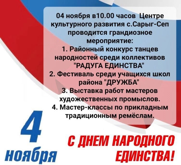 4 ноября в здании Центра культурного развития Администрации Каа-Хемского района в 10:00 часов традиционно пройдет чествование интернациональных семей, после чего начнутся сразу два районных танцевальных конкурса - районный танцевально-хореографический конкурс среди творческих коллективов сельских поселений и организаций с. Сарыг-Сеп, муниципальный этап Фестиваля национальной культуры «Дружба» среди обшеобразовательных учреждений;а также выставка работ мастеров художественных промыслов и мастер-классы по прикладным традиционным ремёслам; фотовыставка "Богат народ талантами". На мероприятии всех желающих ждёт угощение бесплатным борщом.