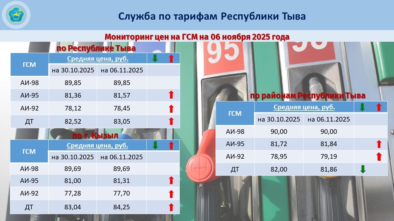 Служба по тарифам Республики Тыва 7 ноя 2025 Согласно мониторингу за неделю рост средних цен на горюче-смазочные материалы произошёл по бензину марок АИ-95, АИ-92 и дизельному топливу